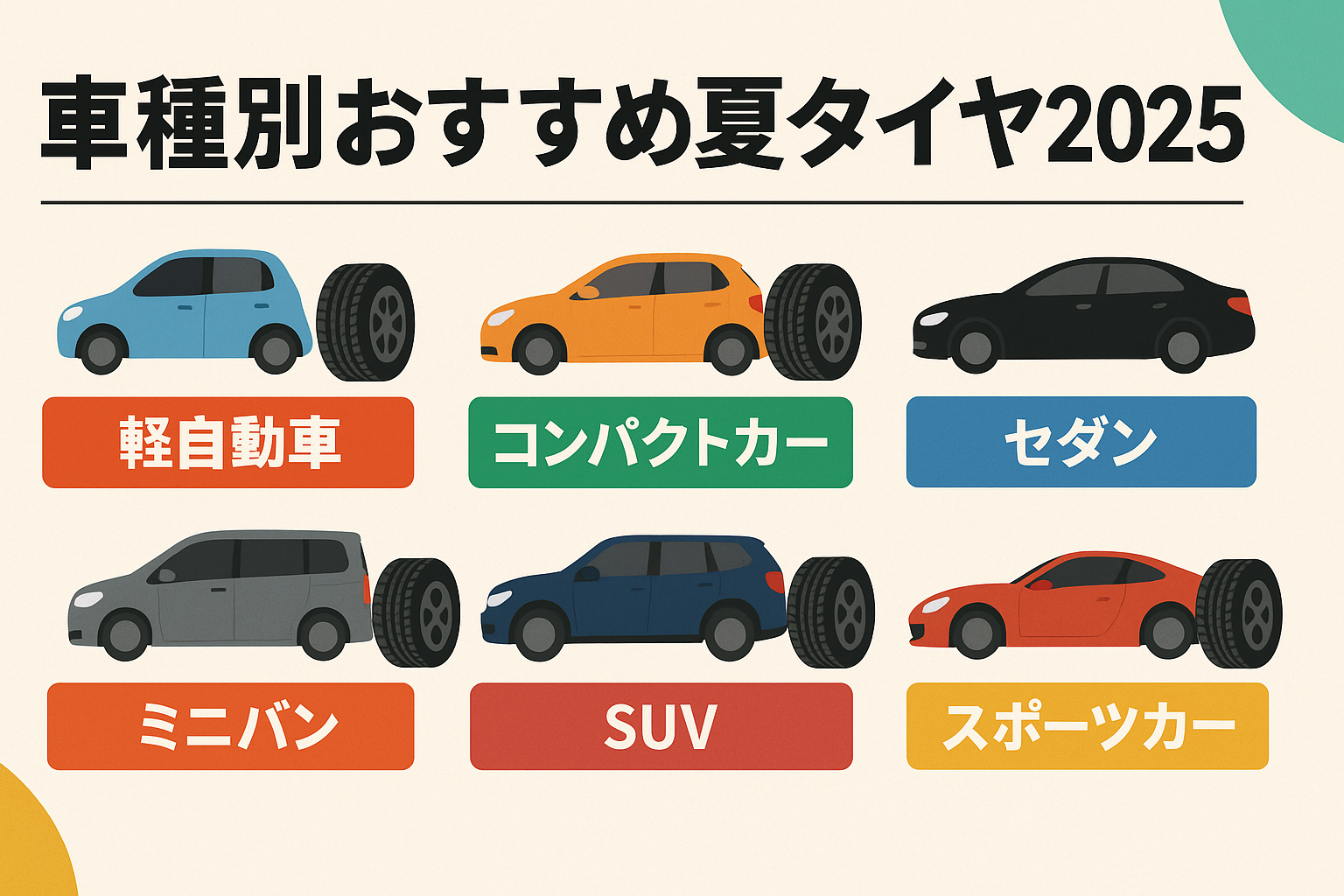 【2025年最新】車種別におすすめの夏タイヤを紹介!軽自動車はコスパ重視、コンパクトカーは低燃費、セダンは静粛性、ミニバンは安定感、SUVは専用設計、スポーツカーはグリップ性能重視。ブリヂストン・ダンロップ・ヨコハマから厳選した12種類を徹底解説。
